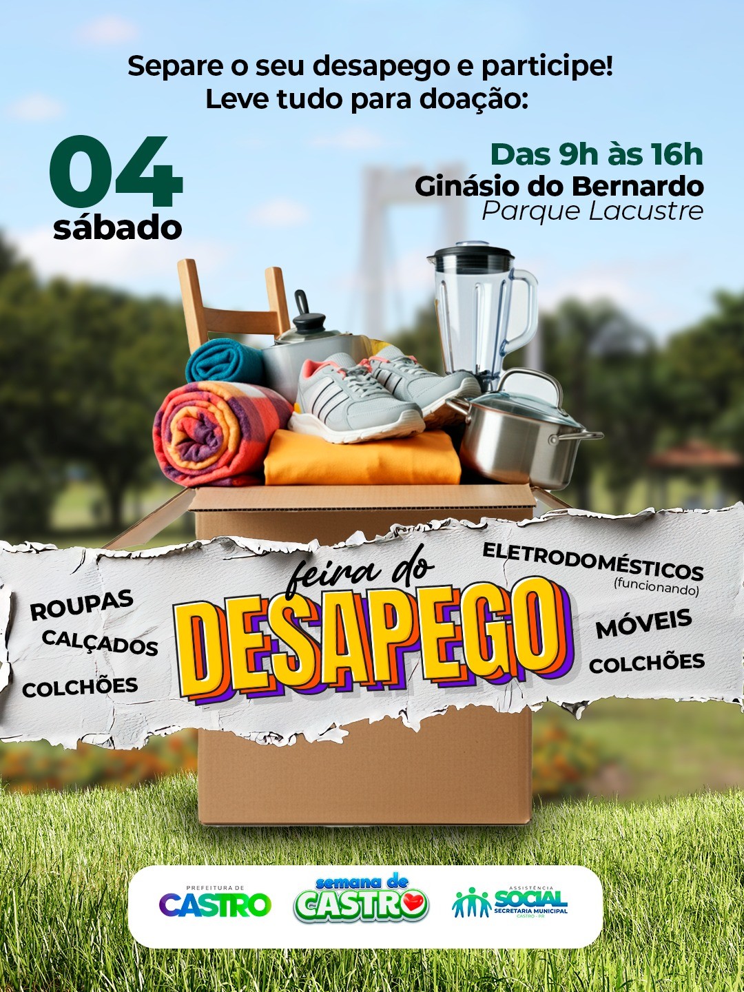 “Não é venda, não é troca. É doação. Queremos incentivar a população a se desapegar de itens que não estão em uso para que outras pessoas sejam beneficiadas”. A afirmação é do secretário de Assistência Social, Günter Lesnau, para explicar como vai funcionar a Feira do Desapego, uma das atividades previstas na programação da Semana de Castro. A feira será neste sábado (04), no Ginásio Estéfano Milinkovic, ao lado da Escola Municipal Professor Bernardo Litzinger, no Lacustre, das 9 às 16 horas.
