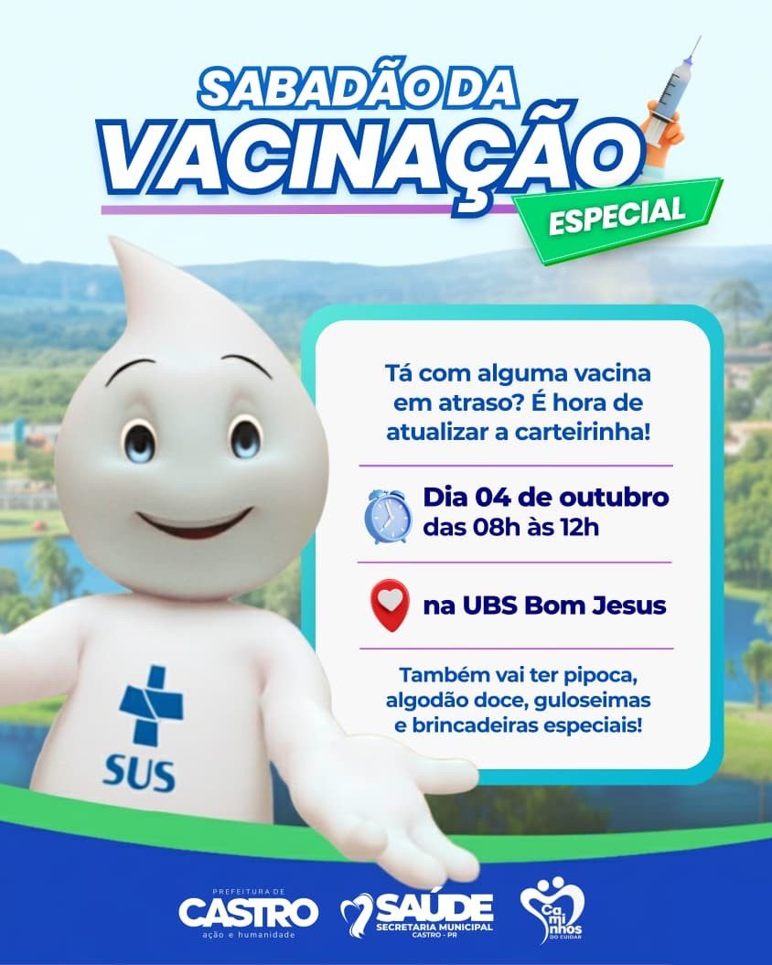 Neste sábado (04), a UBS Bom Jesus, em Castro, promove o "Sabadão da Vacinação Especial", com imunização para todas as idades e atrações gratuitas como brincadeiras, pipoca e algodão-doce, unindo saúde e lazer na Semana de Castro.
