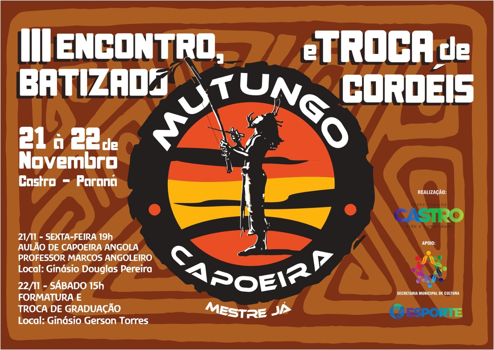 A tradição da capoeira ganha destaque em Castro com o III Encontro, Batizado e Troca de Cordéis do Grupo Mutungo Capoeira, que será realizado nos dias 21 e 22 de novembro. O evento reunirá praticantes, familiares e admiradores da cultura afro-brasileira, fortalecendo a arte, a música e os valores sociais promovidos pela capoeira no município.