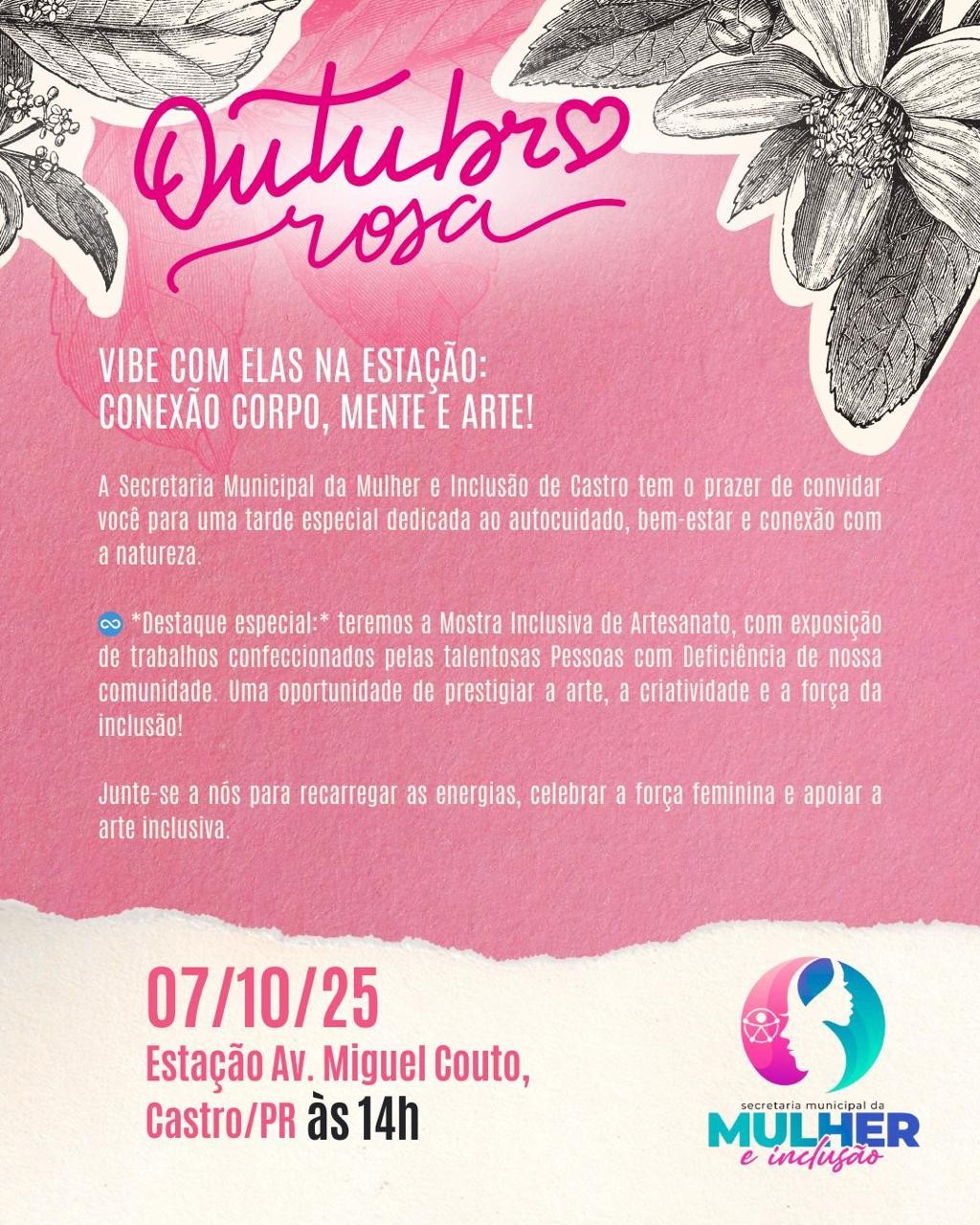 Em clima de renovação e valorização da inclusão, a Secretaria Municipal da Mulher e Inclusão de Castro promove no dia 07 de outubro o evento “Vibe com Elas na Estação: Conexão, Corpo, Mente e Arte”, dentro da programação da Semana de Castro 2025. A iniciativa integra as ações do Outubro Rosa e convida a comunidade para uma tarde dedicada ao autocuidado, bem-estar e conexão com a natureza. A participação é gratuita, mas é indicado confirmar presença antecipadamente neste link.