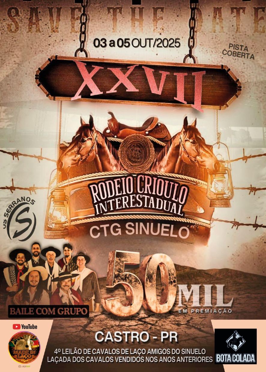 Durante a Semana de Castro, o CTG Sinuelo realiza de 3 a 5 de outubro o 27º Rodeio Crioulo Interestadual, reunindo mais de 50 CTGs e mil competidores no Parque Dario Macedo, com provas de laço, leilão de cavalos, baile, atrações familiares e R$ 50 mil em prêmios, celebrando a cultura gaúcha e fortalecendo a identidade e economia local.