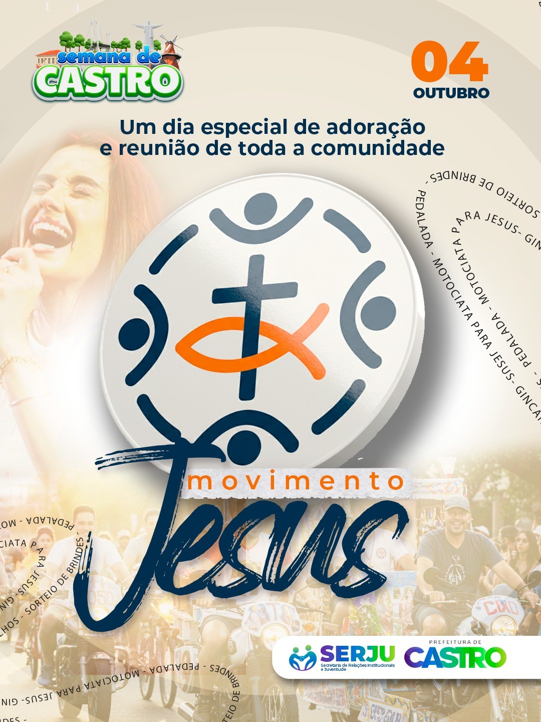 A programação de sábado (04) na Semana de Castro, terá momentos de muita fé e devoção durante o ‘Movimento Jesus’, que integrará famílias e representantes de várias entidades religiosas do município. O evento é solidário e todos os participantes são convidados a doar alimentos ou brinquedos, que podem ser usados e em bom estado, no Parque Lacustre. “E já fica uma sugestão: ao doar um brinquedo, deixe junto um bilhetinho, um cartão, com uma mensagem para a criança que vai receber”, recomenda Régis Moreno, vice-prefeito e secretário municipal de Relações Institucionais e Juventude.
