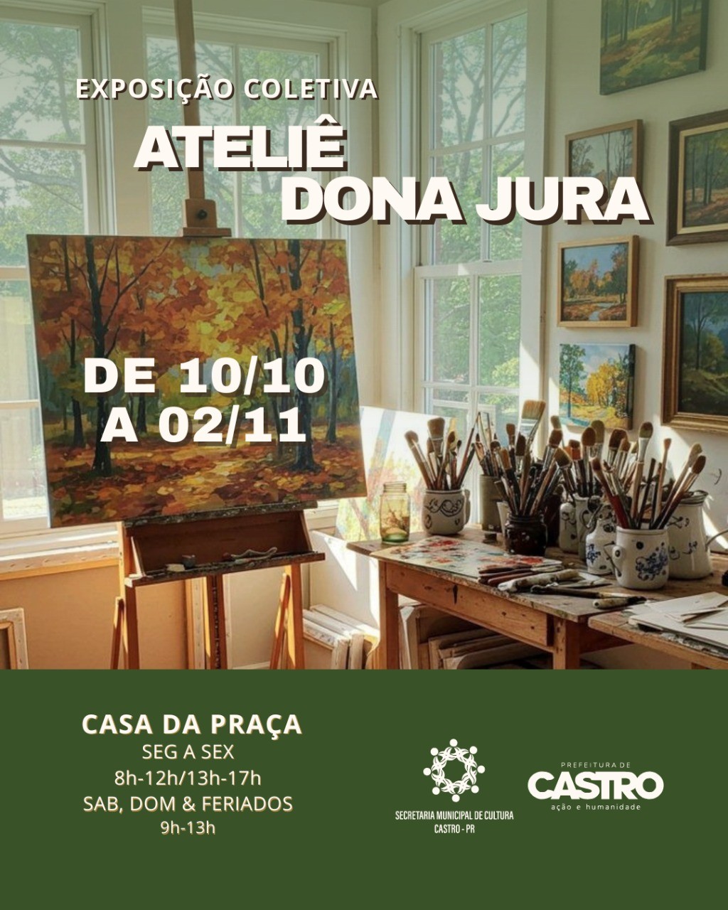 A Secretaria Municipal de Cultura de Castro, com apoio da Prefeitura, promove no dia 10 de outubro, às 18h30, na Casa da Praça, a abertura da exposição do Ateliê Dona Jura, que faz parte da Semana de Castro. O evento destaca a produção artística de Helga Bertolini, referência na cena cultural local, e das colegas que integram o grupo de criação e amizade que leva o nome de sua mãe, Juracy de Carvalho Pusch, a Dona Jura.