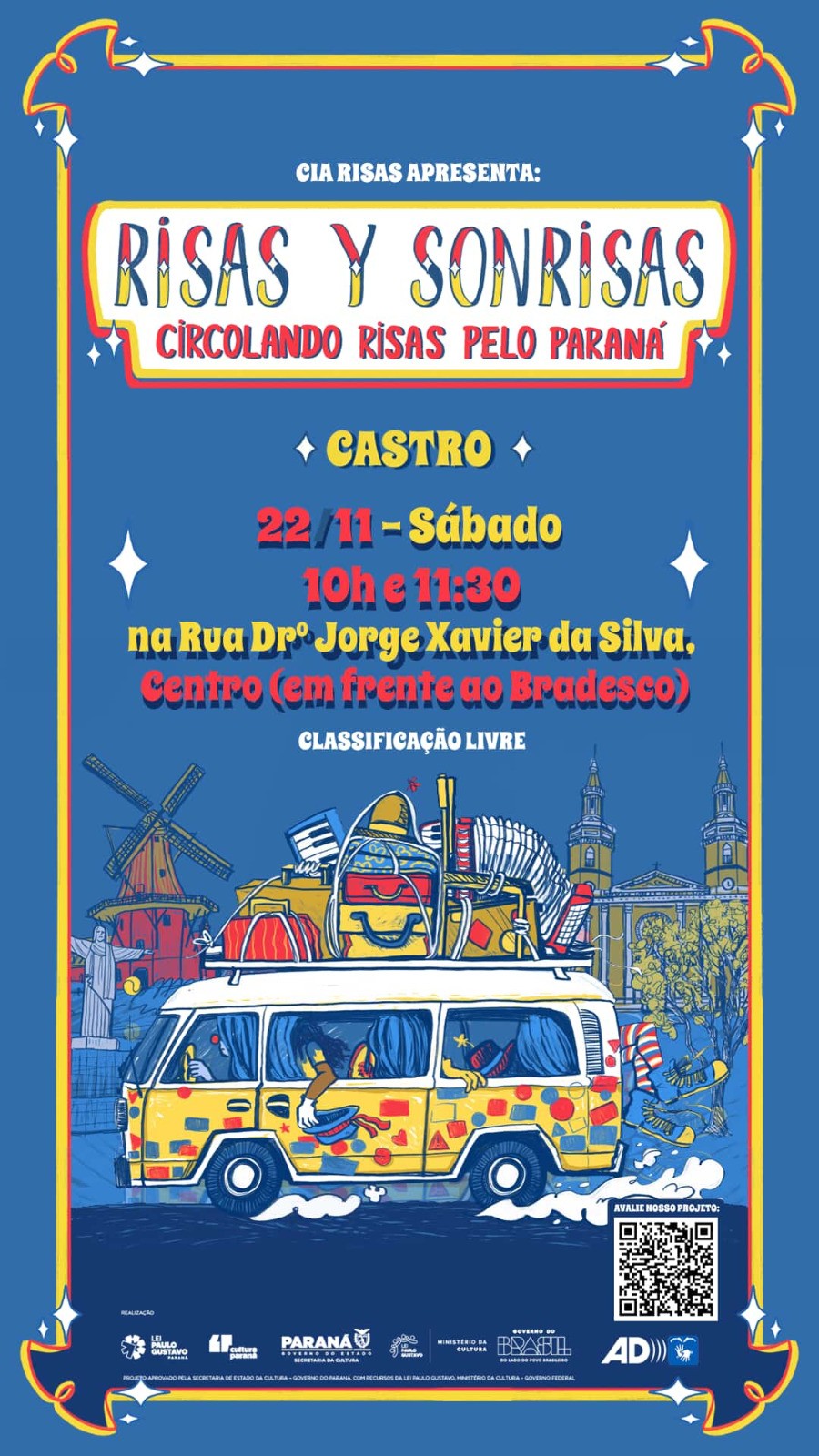 A Cia Risas chega a Castro para apresentar o espetáculo “Risas y Sonrisas – Circolando Risas pelo Paraná”. A montagem resgata cenas clássicas dos palhaços e dos circos tradicionais, trazendo-as para os dias atuais com novas variações, improvisações, música ao vivo e interação direta com o público, criando cenas que aproximam o riso de diferentes gerações.